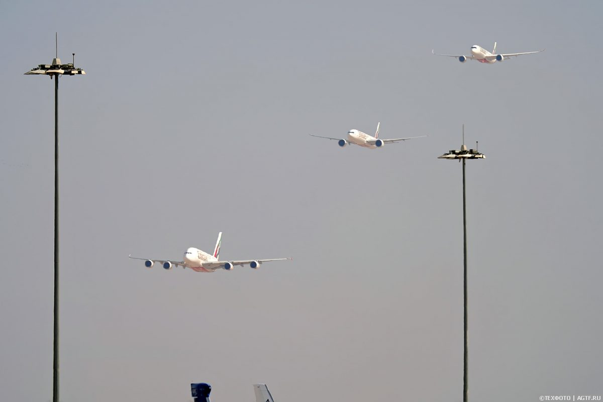 Европейцы «ответили» более современной техникой. Флагман широкофюзеляжных машин Airbus модель A350-1000 совершила несколько эволюций, даже разойдясь (в кадре) с Boeing 737 упомянутой выше Flydubai, как говоря, что Эрбас и Боинг летят в разные стороны. Но, надо признать, одинаково хорошо.