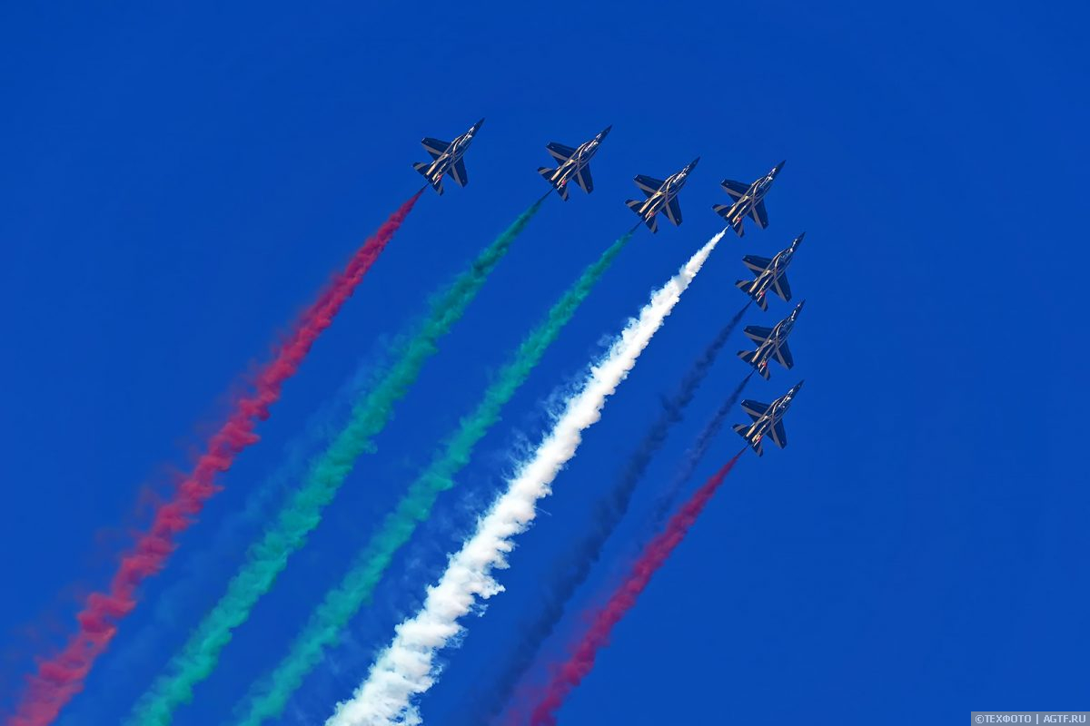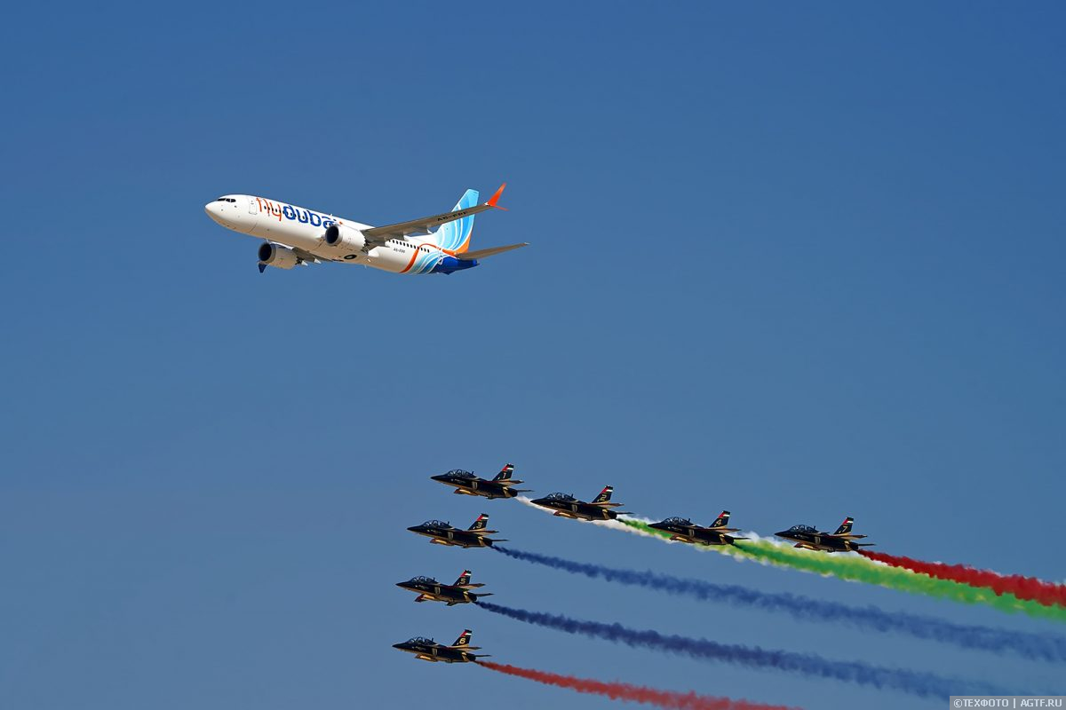 После такого парада в небе появились «Рыцари» — пилотажная группа из ОАЭ «Al Fursan». Выступление предварялось совместным пролетом с Boeing 737 MAX 8 авиакомпании Flydubai.