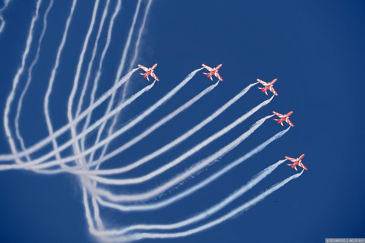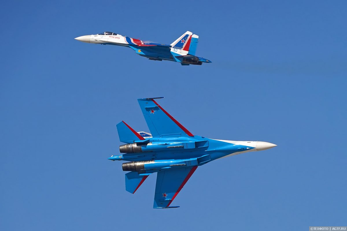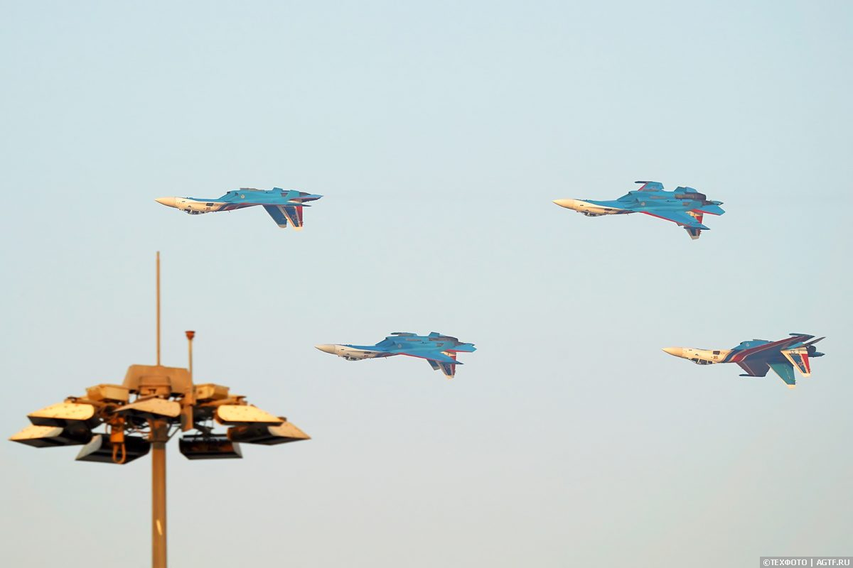 Российские летчики показали самые разнообразные виды высшего пилотажа – группами по 6 и 4 машины, парой (эффектный встречный пилотаж) и одиночный.