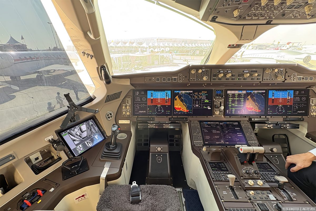 Рассмотреть С919 со всех сторон мы сможем в рамках летной программы, а сейчас пользуясь шансом решили заглянуть в святая святых любого самолета – в кокпит. Кабина выполнена в философии Airbus, но отличается по эргономике. Выглядит современно, а опыт эксплуатации мы сможем узнать из первых международных заказов. Пока же более 30 таких машин летают в Поднебесной.