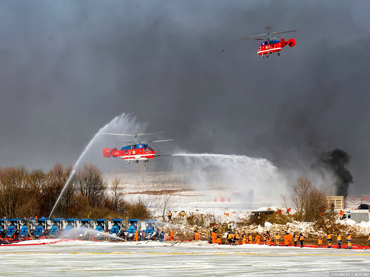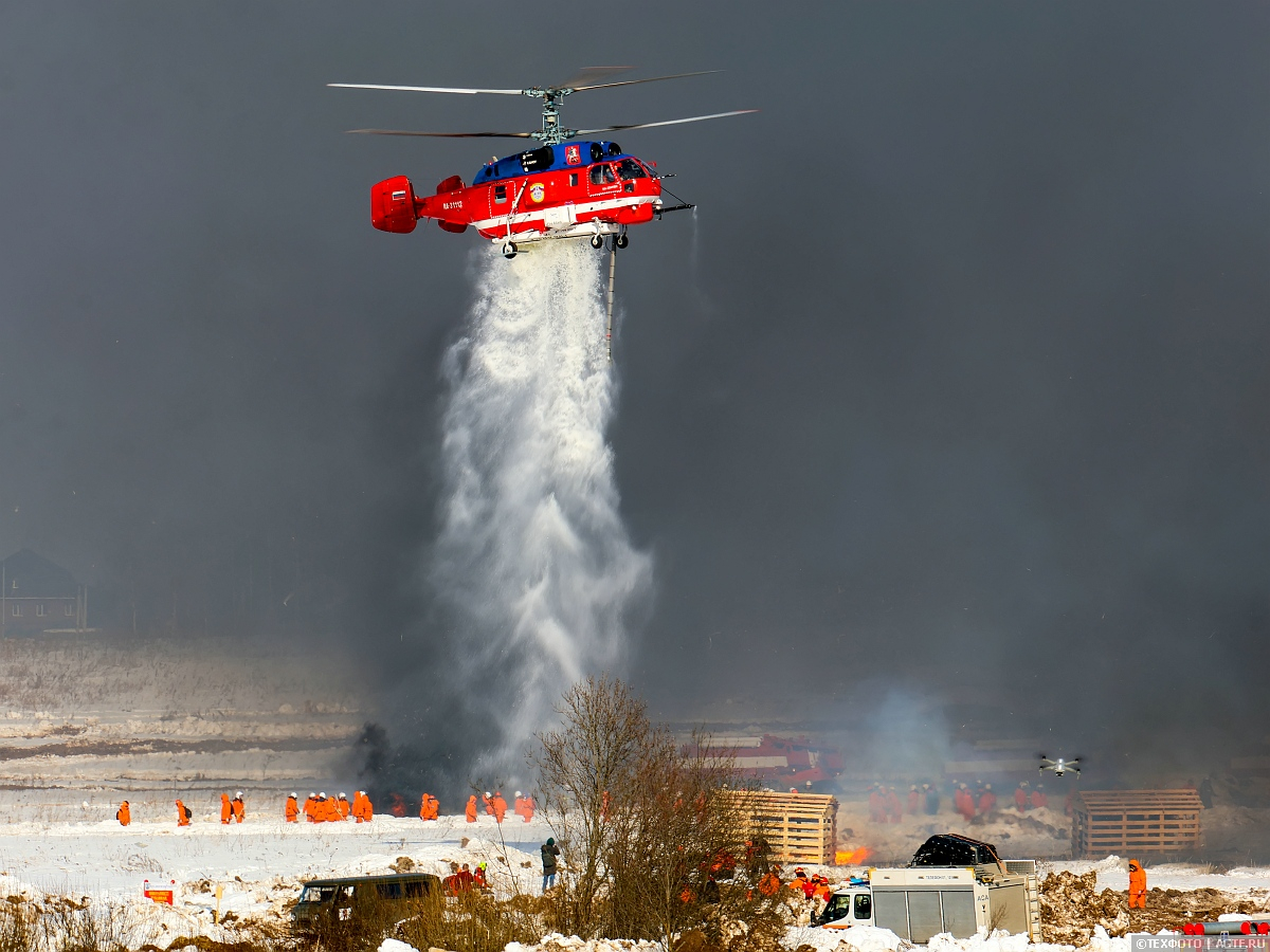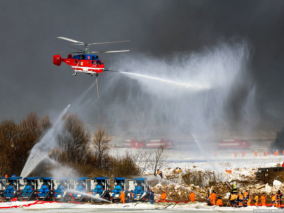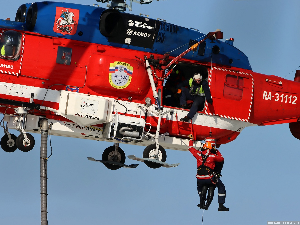 Вертолет Ка-32 Московского авиацентра снабжен уникальной система горизонтального и вертикального пожаротушения, с её помощью можно и создавать прицельную струю воды дальностью до 40 метров, и сбрасывать в эпицентр пожара до 3 тонн воды одномоментно.