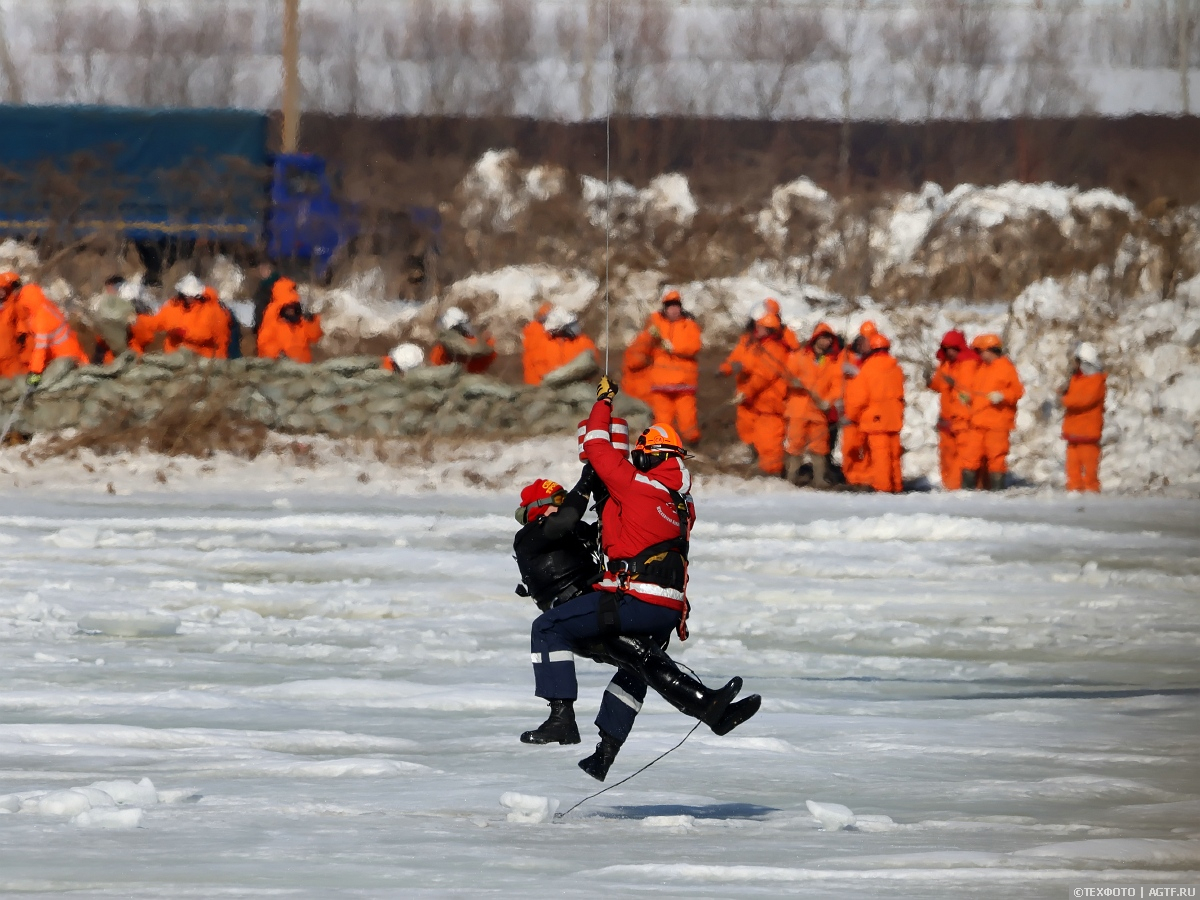 На учения было продемонстрирована эвакуация человека провалившегося под лед.